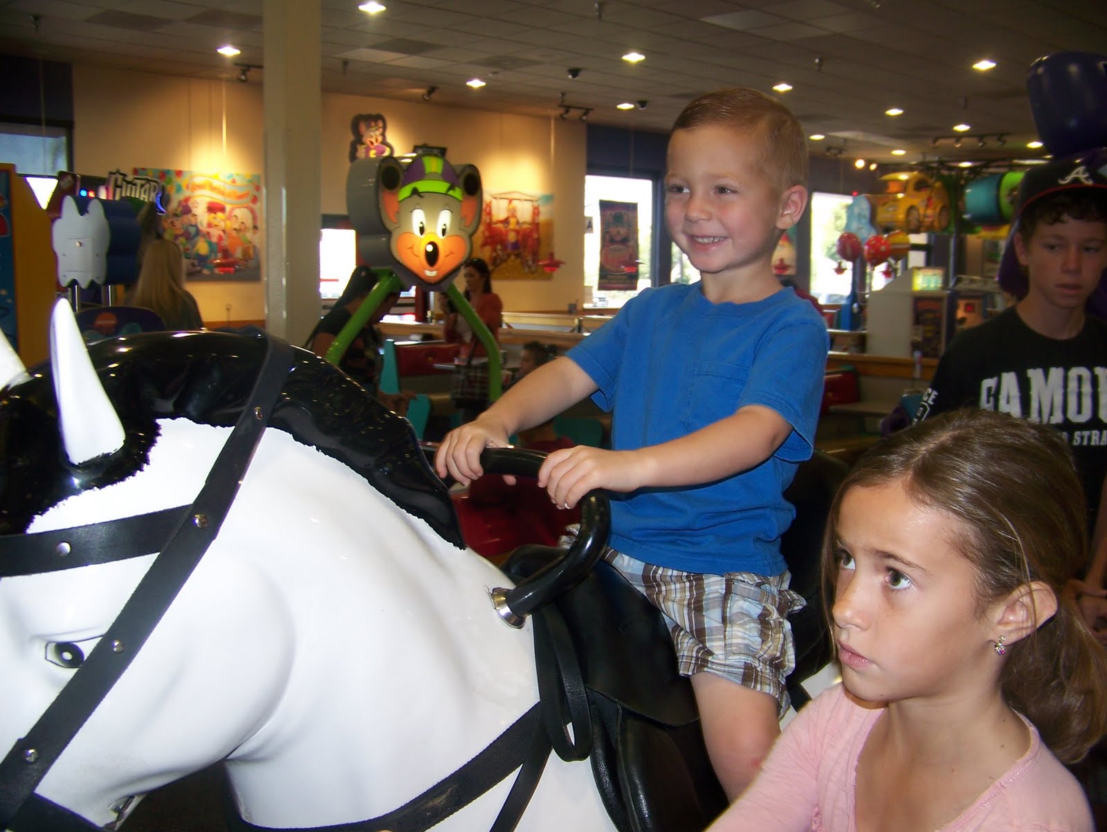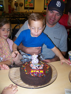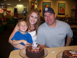 Having a 3 year old is so stinkin fun! We had a fun filled weekend celebrating Noah's 3rd birthday. For the past couple months Noah has been talking about having a "chuck e cheese" birthday. So Chuck E Cheese it was! The fesitivites started on Saturday when my parnets came over. My dad was able to go to Priesthood session with Todd and the rest of us got to hang out with my mom. Noah with his gift from grandma, a dodger outfit! He LOVES baseball, basketball, and football. He basically is either dribbling a basketball or playing catch. I'm not even kidding. The boy LOVES sports!